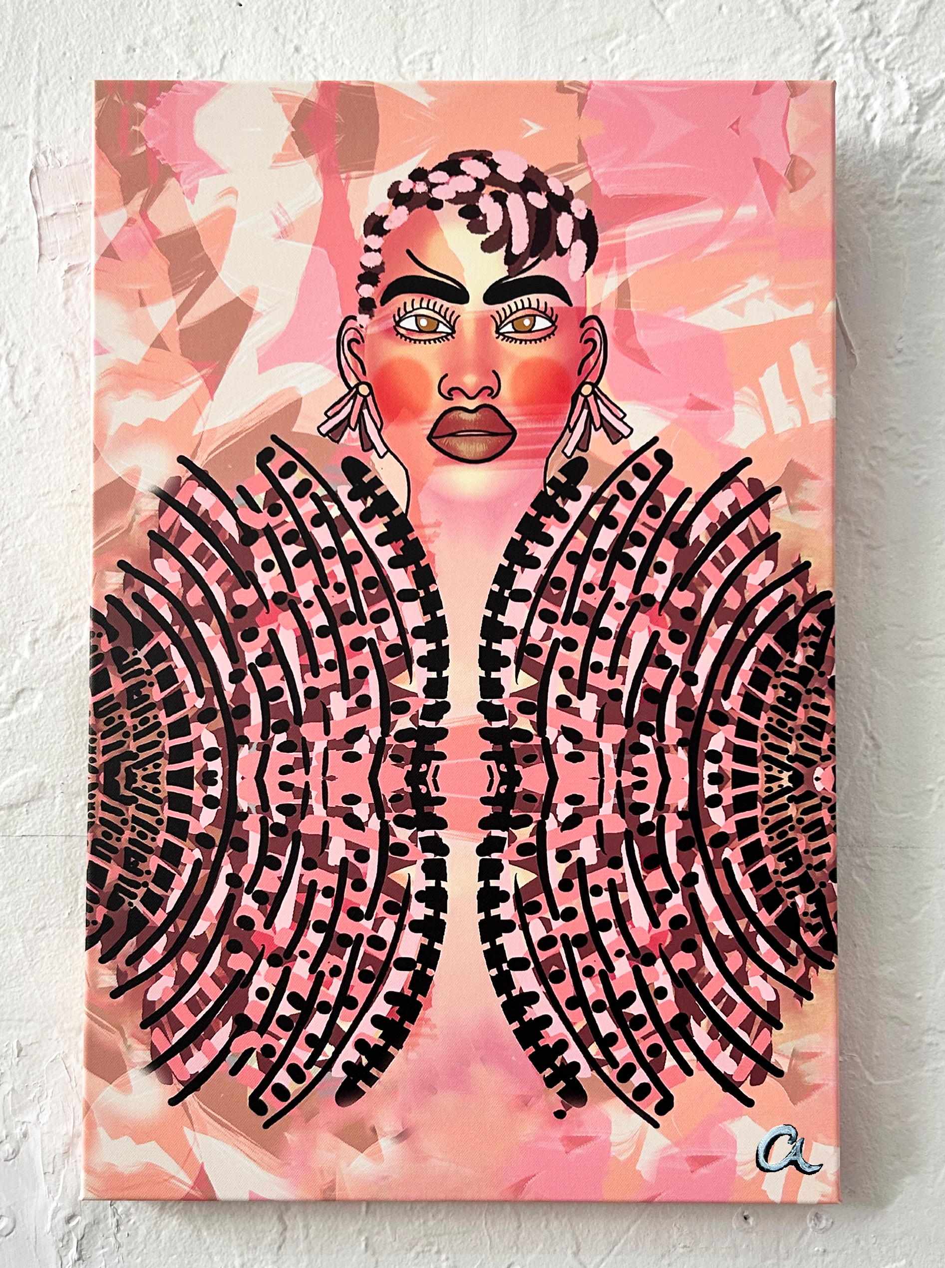 Radiant Warrior is a tribute to bold feminine power, inspired by icons like Grace Jones, whose presence redefined strength and style. With piercing eyes, bold makeup, and short textured locks, she commands the canvas with unapologetic authority. Her garments double as armor and expression, symbolizing both resilience and personal truth. Surrounded by soft pink brushstrokes, Radiant Warrior shows that power doesn’t have to be hard; it can live in softness, too. This piece is a statement of fearless femininity and the beauty of standing strong while embracing your vulnerability.